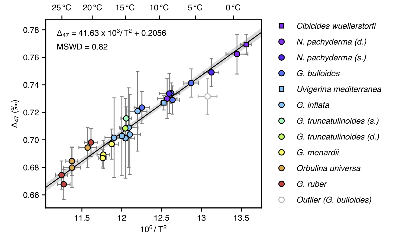 Over the past decade, a number of calibration studies have investigated the relationship between ∆47 and temperature in biogenic carbonates such as corals, otoliths, brachiopods, molluscs, foraminifera and coccoliths (Ghosh et al., 2006; Tripati et al., 2010; Thiagarajan et al., 2011; Zaarur et al., 2011; Eagle et al., 2013; Grauel et al., 2013; Came et al., 2014; Douglas et al., 2014; Wacker et al., 2014; Katz et al., 2017). Only two of them specifically focus on foraminifera: the finding by Tripati et al. (2010) that different foraminiferal species appear to follow a single relationship between temperature and ∆47 was subsequently confirmed by Grauel et al. (2013). These early calibration studies produced a significant body of observations whose importance should not be understated. However, both of them predate substantial methodological advances in the field of clumped isotope measurements, namely the definition by Dennis et al. (2011) of an "absolute" reference frame anchored to theoretical equilibrium Δ47 values in CO2, and the systematic distribution of inter-laboratory carbonate standards. As a result, using these early observations to precisely reconstruct past seawater temperatures is not straightforward.
